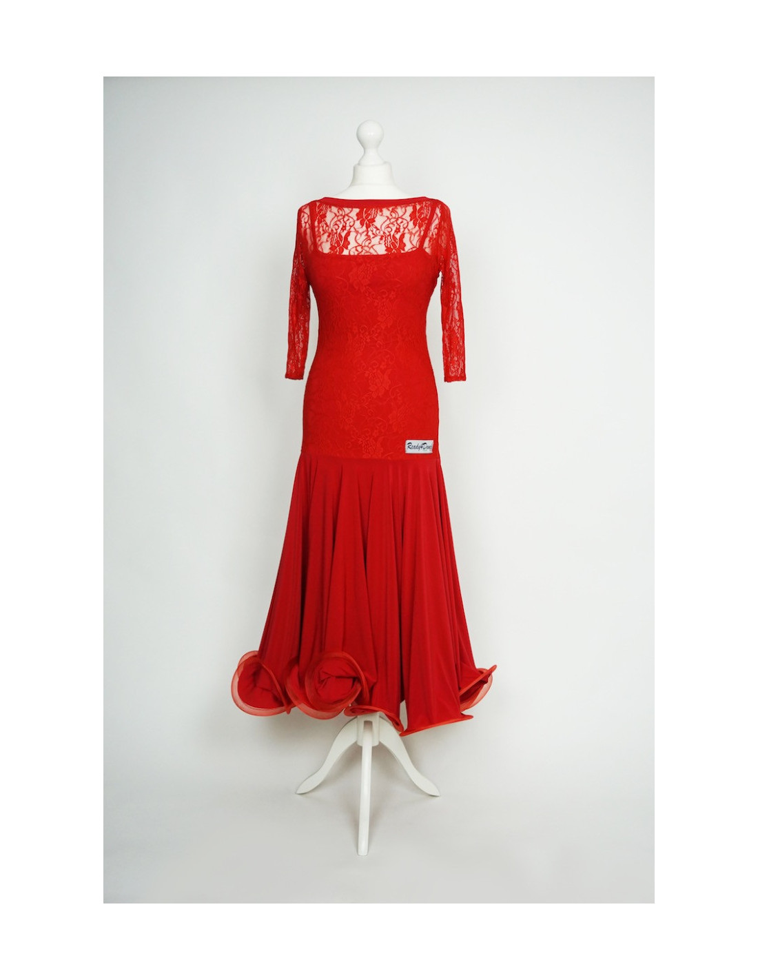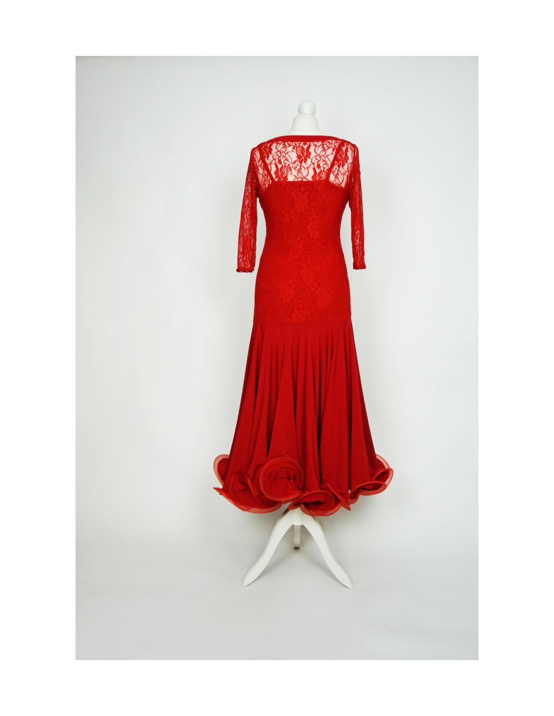 woman's ballroom dress in soft stretch fabric; the yoke and sleeves are in lace, complete with an body ; hoop insered in the hem. Available 05 lack e 04 red, sitze S, M, L, XL
