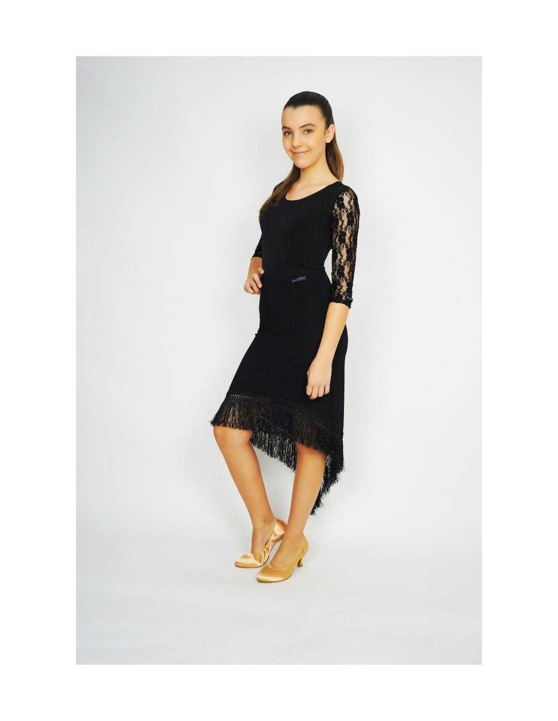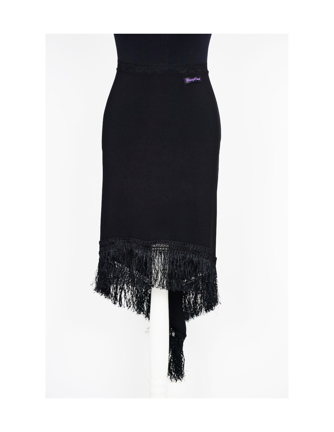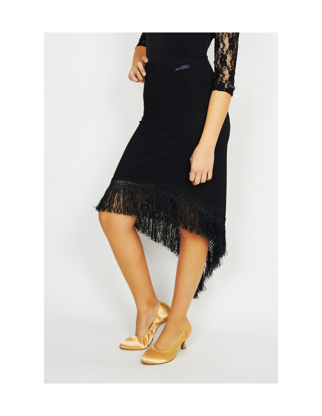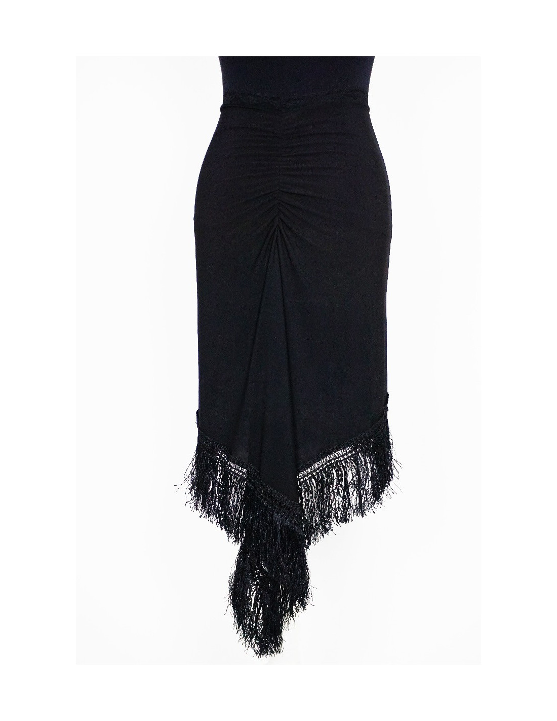 Latin skirt in soft, comfortable stretch fabric; gathered at centre back, lace trim at the waist and fringed hemline. Available in black 05, sizes S, M, L
