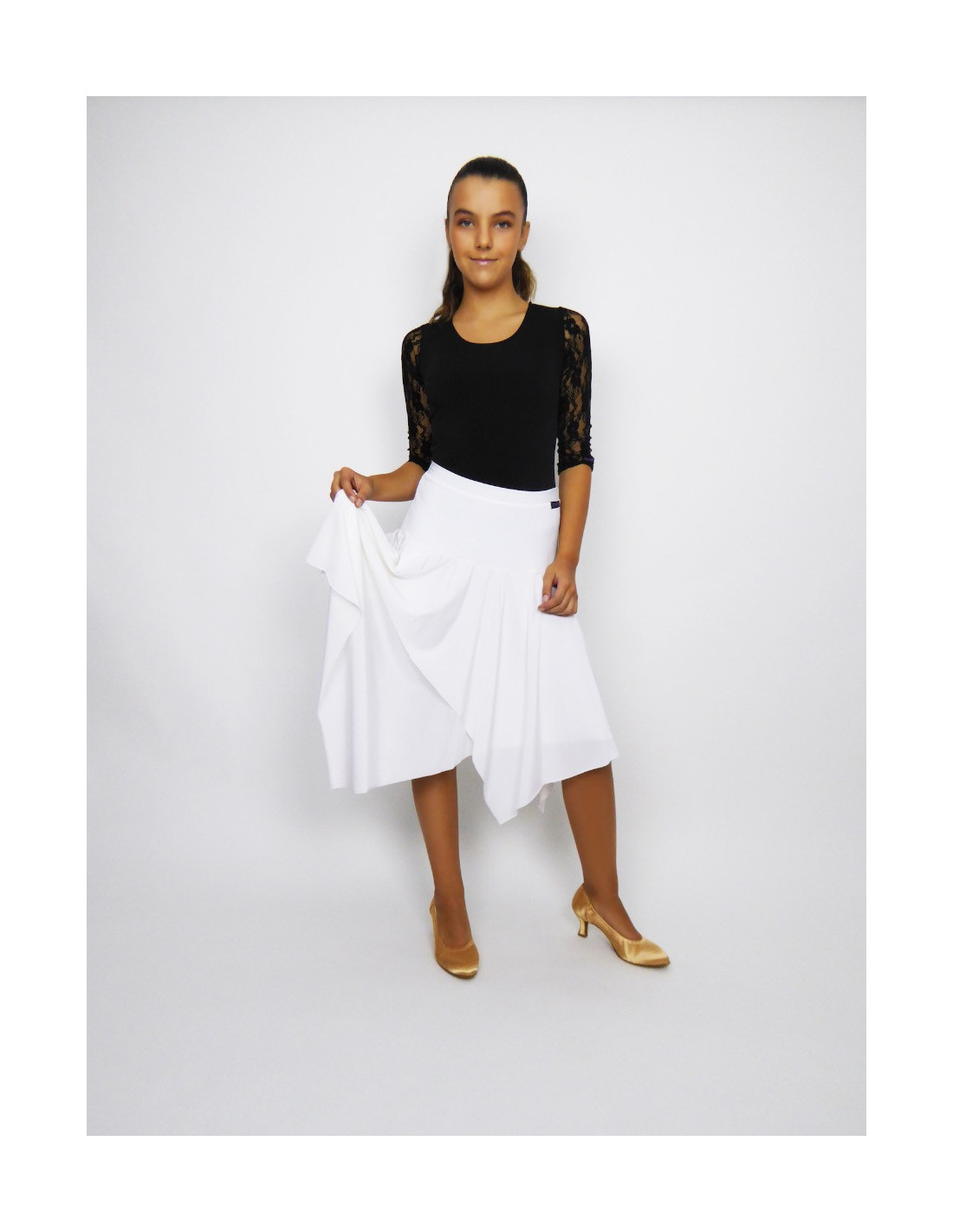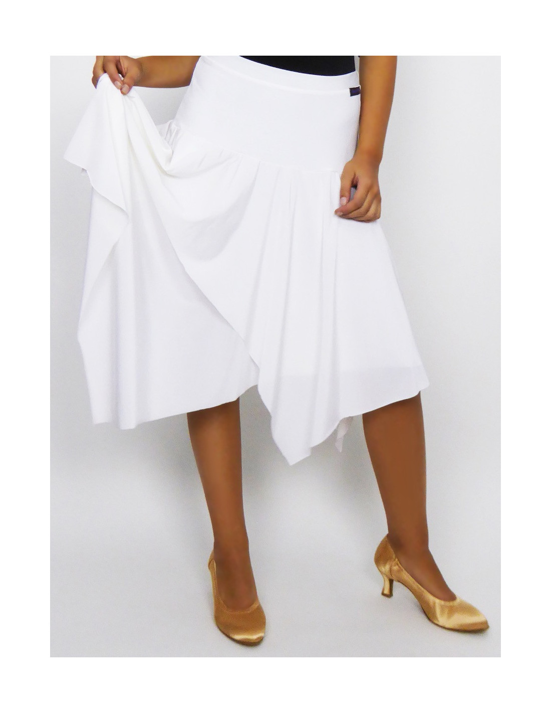 Women's ballroom skirt in soft stretch fabric, double-layered with handkerchief hemline. Colours available: 04 red, 05 black, 33 white, sizes S, M, L, XL
