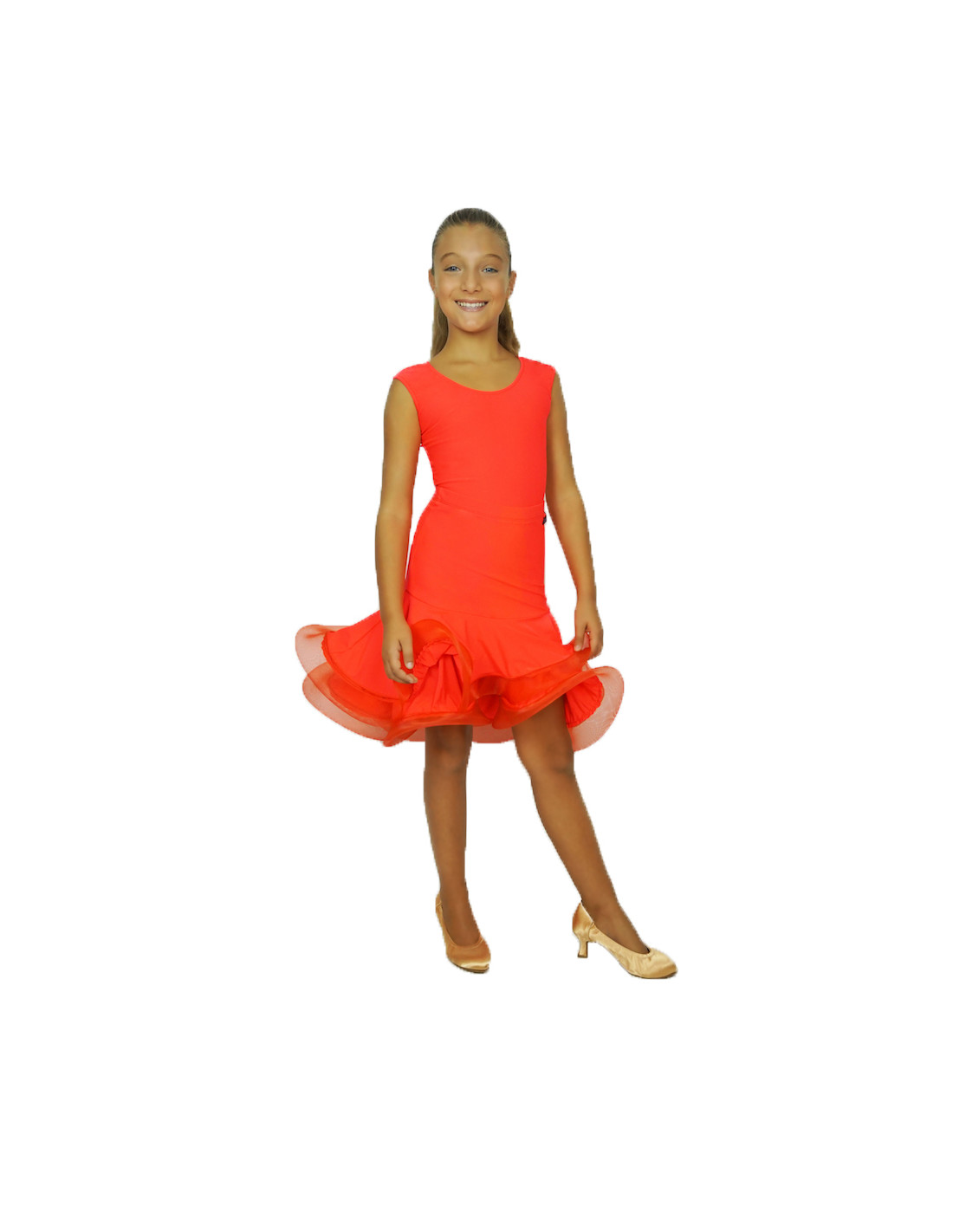 Ready4Dance Cinderella – girls’ dance outfit with flowing skirt and crinoline hem, made from technical stretch and breathable microfiber, back gathering detail to enhance the silhouette, ideal for Latin American dance and ballroom dancing, high-quality Made in Italy tailoring, available in sizes 10 to 16 years