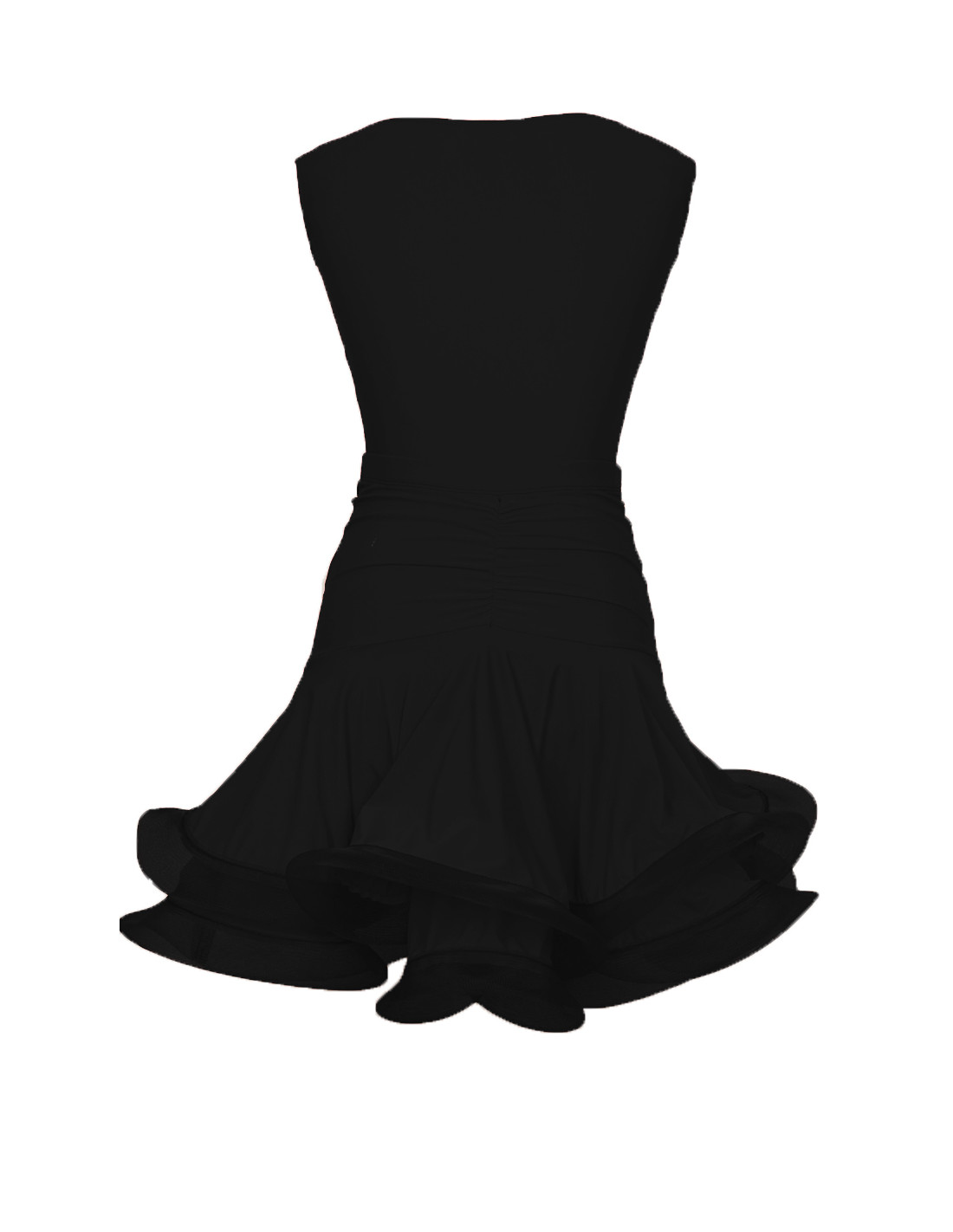 The flowing skirt with a crinoline hem is designed to enhance movement fluidity, creating a light and harmonious effect that follows every step on the dance floor. The gathered detail at the back adds a refined touch that enhances the silhouette while maintaining a clean and elegant line.
