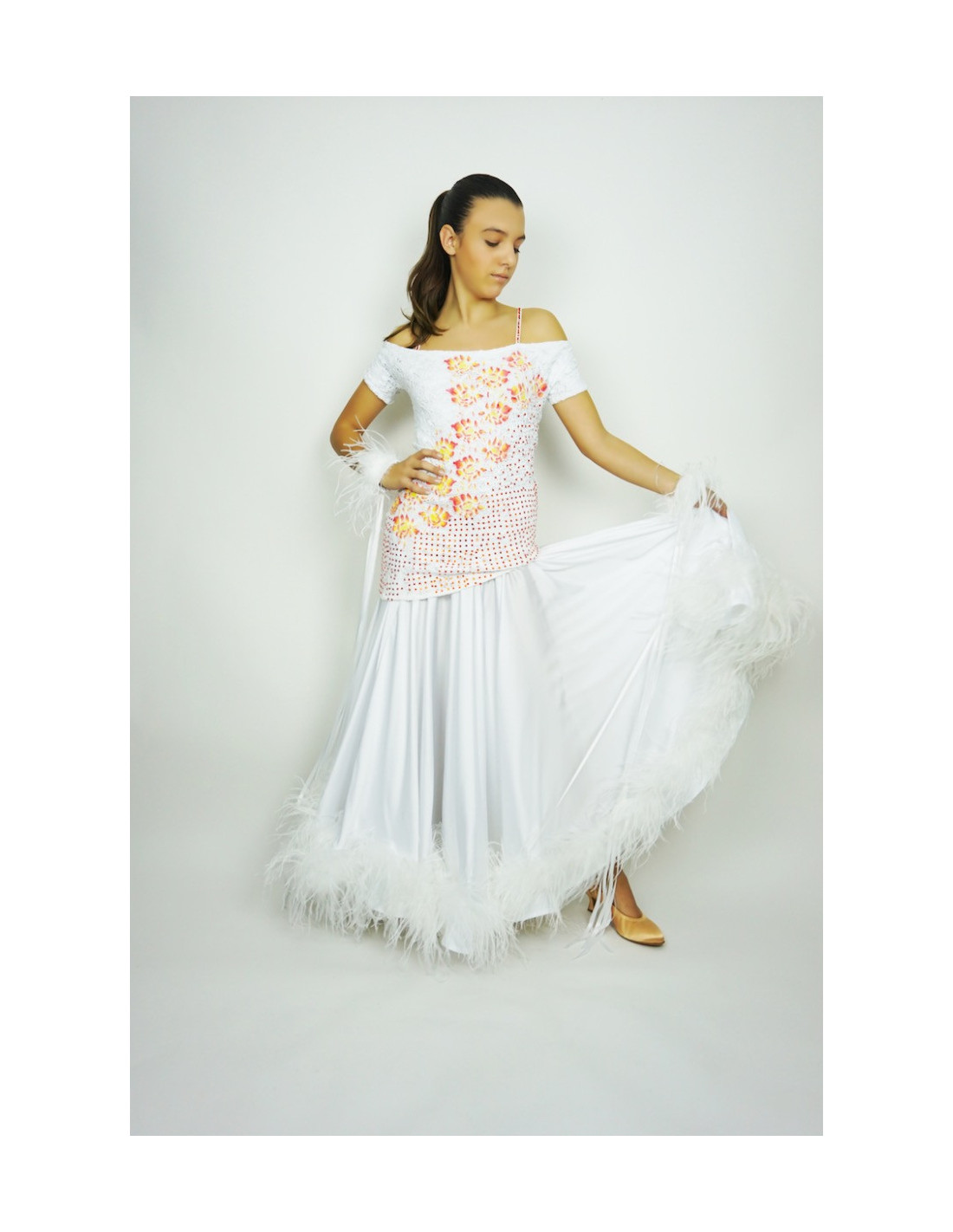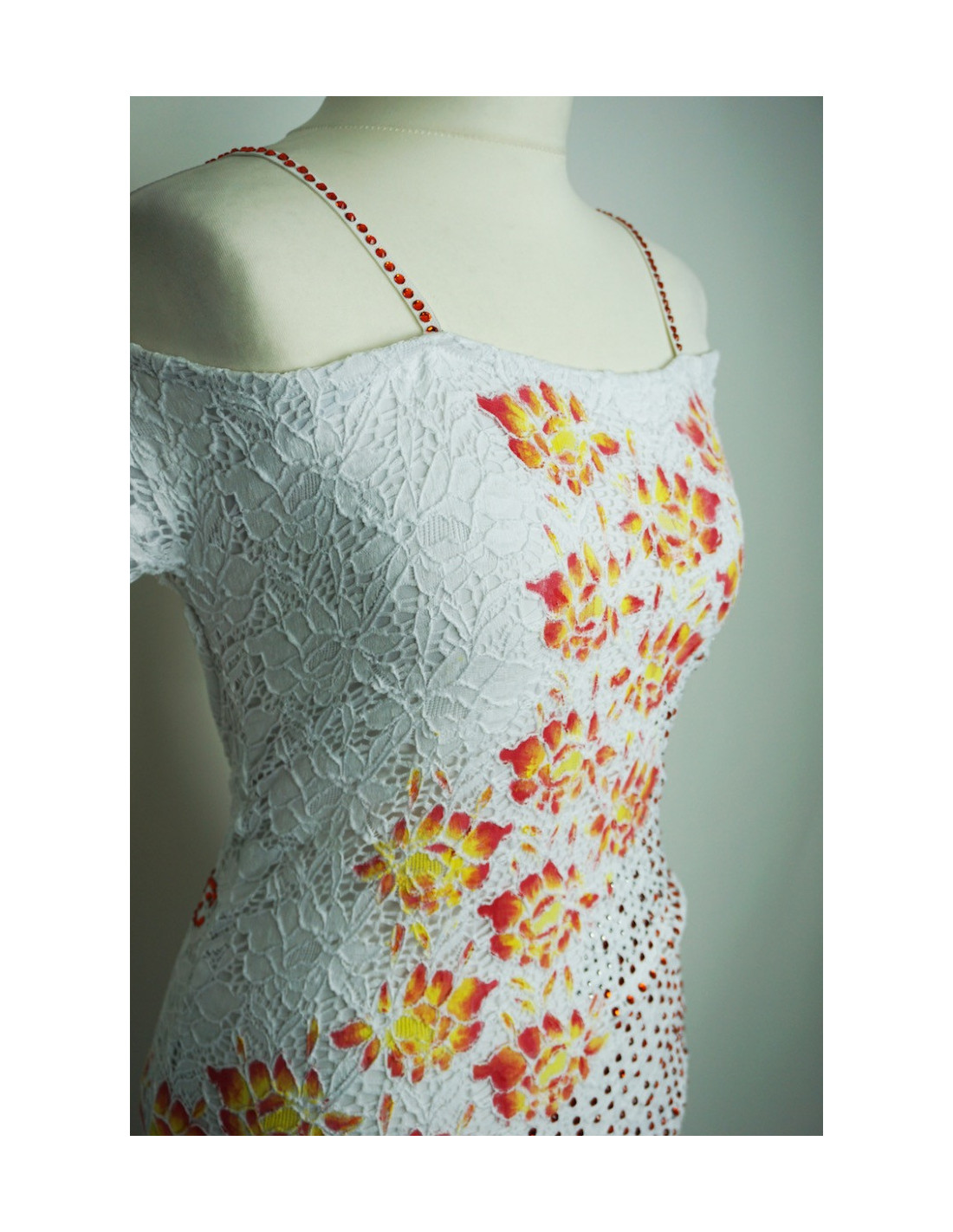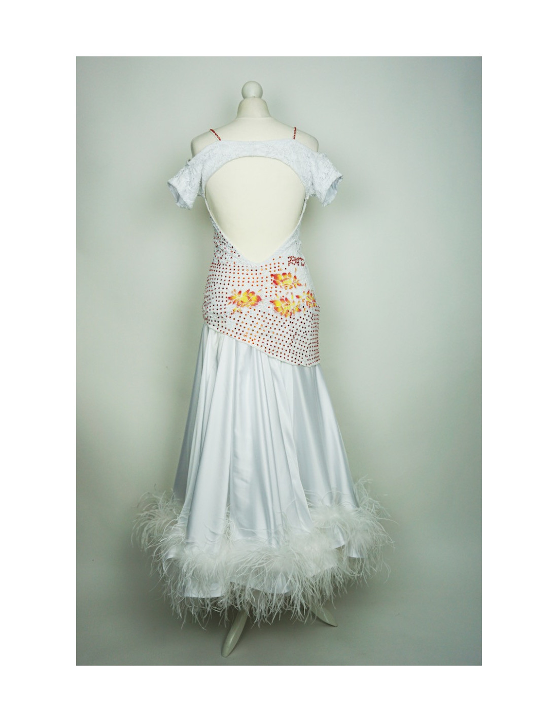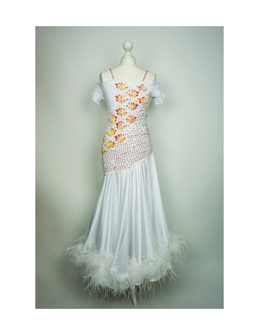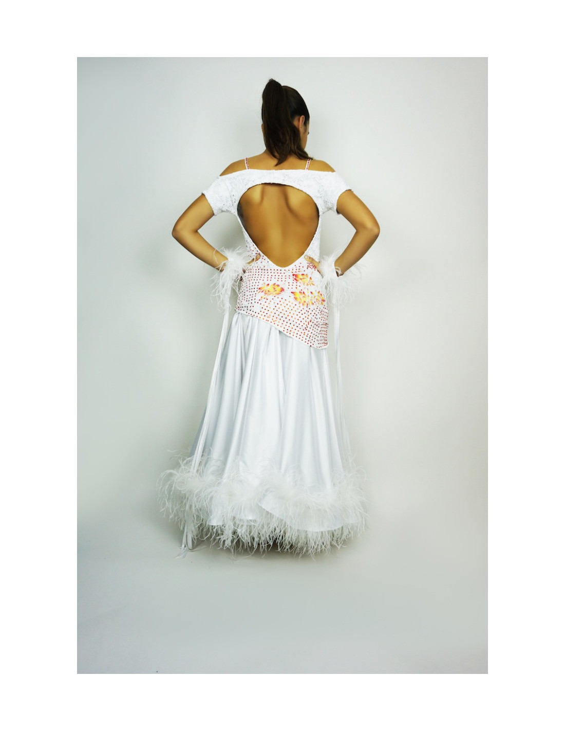 Elegante abito standard, realizzato con prezioso pizzo dipinto a mano e leggerissimo raso. Composto da bustino in pizzo con scollo a barca davanti che scopre le spalle e profondo dietro, arricciato al fianco sinistro da cui parte l' ampia gonna con crinolina inserita nell' orlo. Il tutto impreziosito da strass.