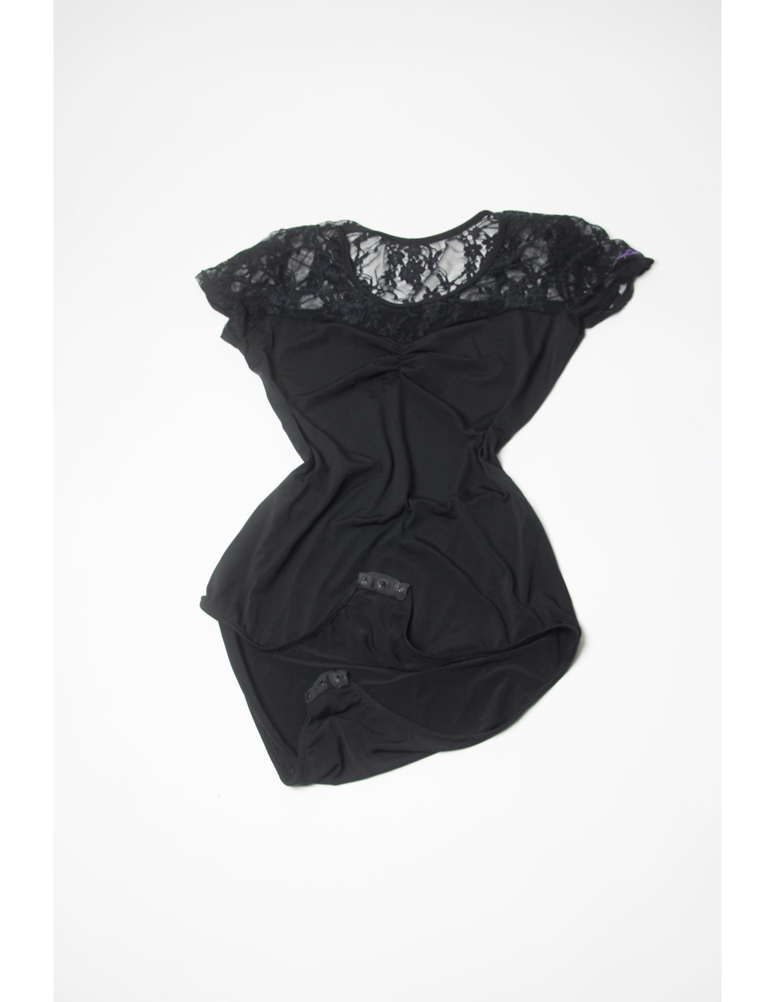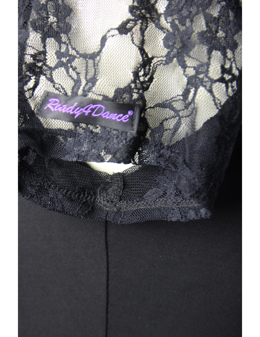 Maniche e sprone in pizzo ricamato che aggiungono un tocco di eleganza professionale. La piccola arricciatura frontale valorizza la linea del corpo, rendendo il capo perfetto per ogni esibizione.