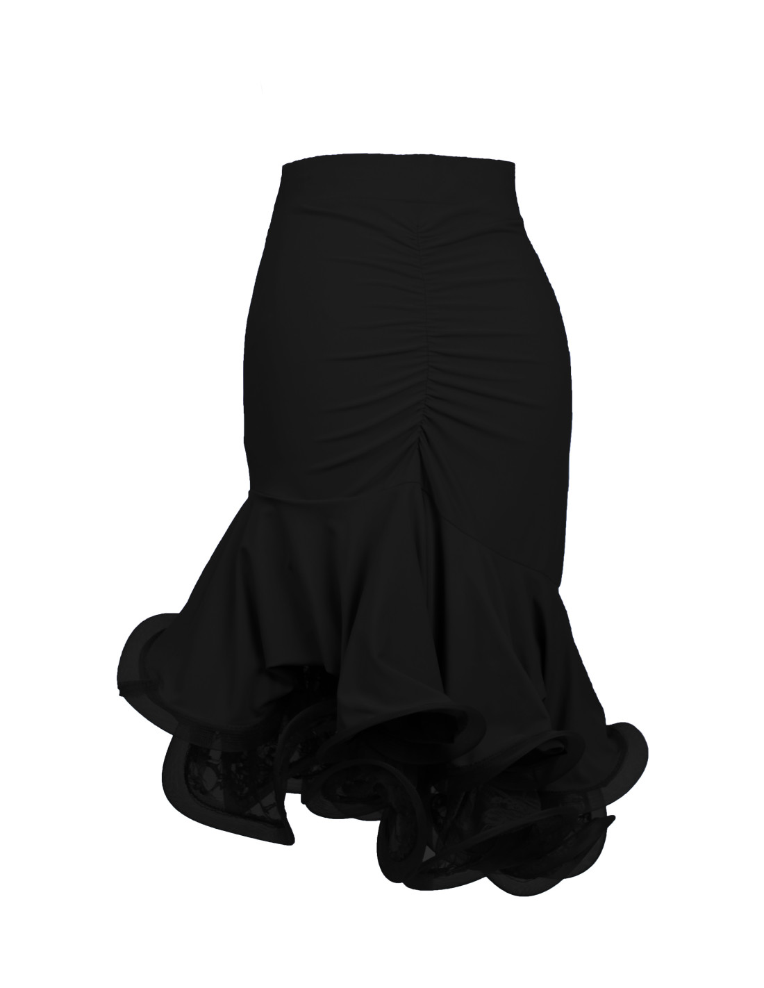 La baschina asimmetrica valorizza la linea del corpo e dona un look moderno e dinamico, mentre la doppia balza a ruota esalta il movimento tipico della danza latina. L’inserto in pizzo impreziosisce il design, mentre la crinolina doppia all’orlo conferisce volume, leggerezza e un effetto scenico professionale, ideale per gare e saggi di danza.