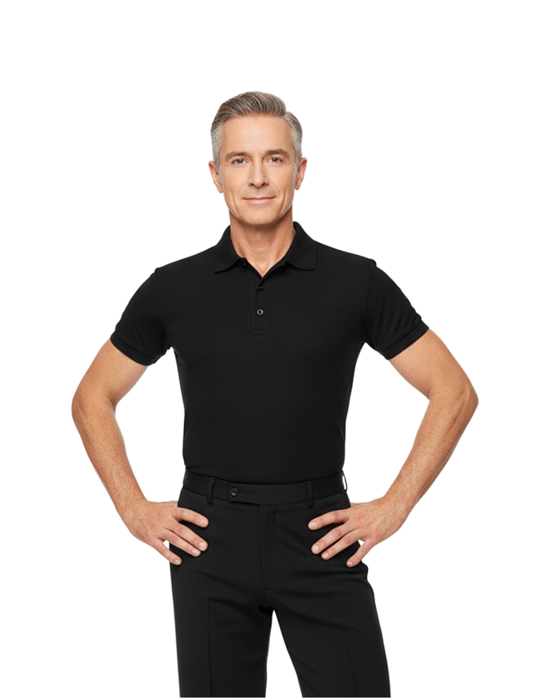 Polo uomo BONN nera in tessuto tecnico traspirante ed elasticizzato, ideale per danza, sport e tempo libero. Leggera, confortevole e dal design moderno slim fit, garantisce massima libertà di movimento e stile in ogni occasione. Prodotta interamente in Italia. Disponibile nelle taglie S–XXL.